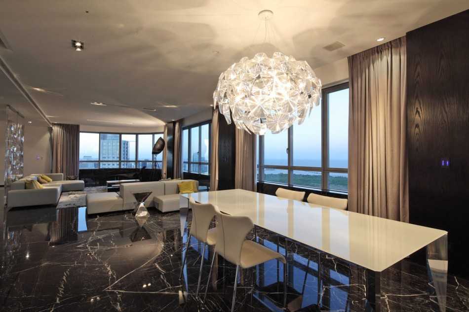 При грамотном использовании напольных и настольных светильников можно делить пространство на определенные функциональные зоны. Благодаря использованию глянцевых поверхностей – визуально кажется, что пространство расширяется, становится более светлым.