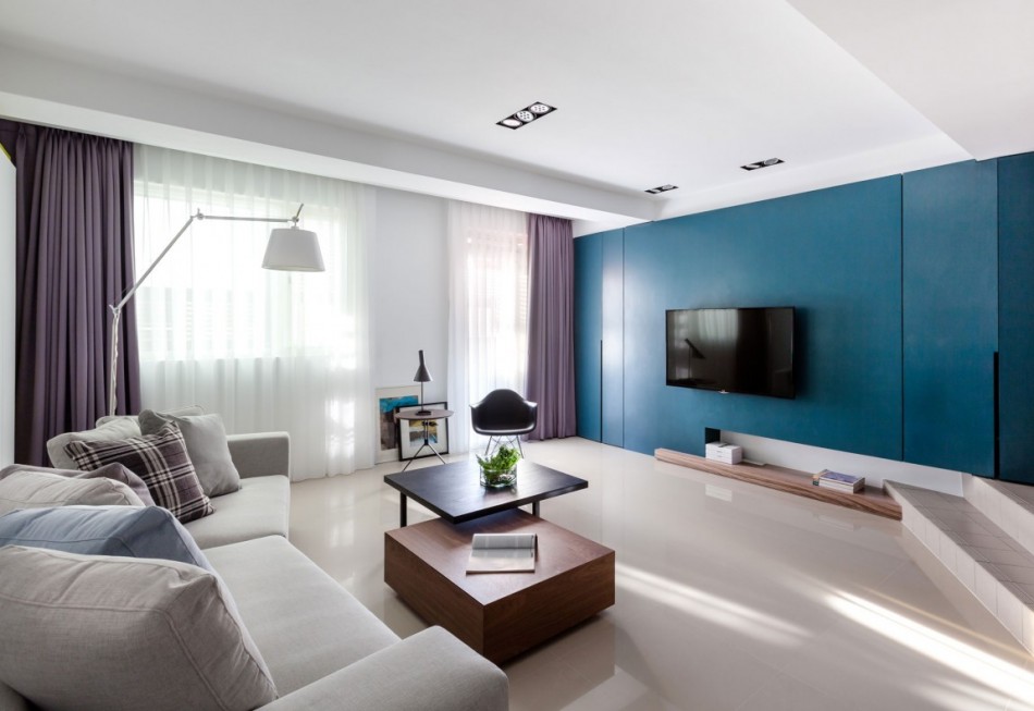 На фоне матовой стены будет хорошо смотреться заливной глянцевый пол. Создадут креатив и футуристический образ подвесные шкафы и замысловатые лампы. Любители кино и качественной музыки могут в гостиной установить аудиосистему. Барная стойка создаст параллель между местом приготовления пищи и гостиной.