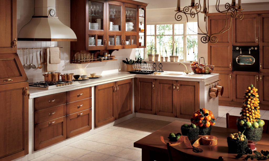 Кухня в данном стиле должна быть простой и выглядеть максимально натурально. На окна можно повесить занавески из хлопка, украшенные лентами. Стол обязательно следует накрыть скатертью, вышитую вручную. Стулья должны иметь мягкие сидения. А для освещения идеально использовать люстру с кованым основанием. Для декора используют картины с изображенным на них натюрмортом, глиняные вазы и керамические тарелки.