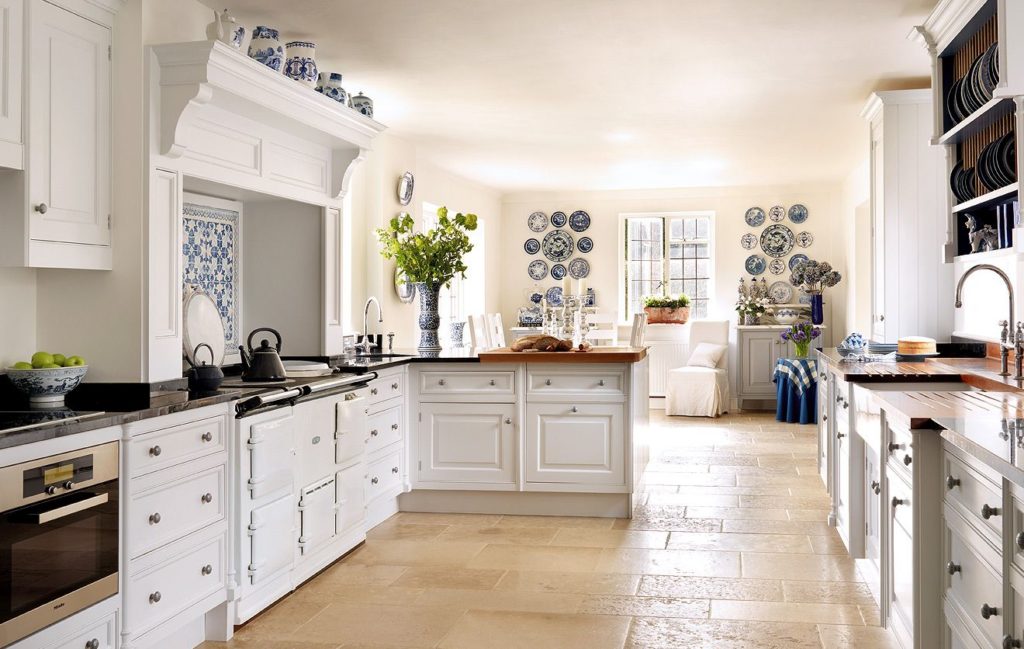 - Выбор покрытия для пола зависит от того, в деревенском стиле какой страны вы хотите оформить кухню. Например, греческий стиль и прованс предполагают обустройство каменного пола, ведь такой дизайн зарождался в жарких регионах, где в интерьерах нужна прохлада. Для домов холодных районов оптимальны деревянные полы, потому что они изначально более теплые. Но для кухни в стиле кантри можно найти оптимальное решение: уложить на пол керамическую плитку или даже камень, обустроив подогрев.