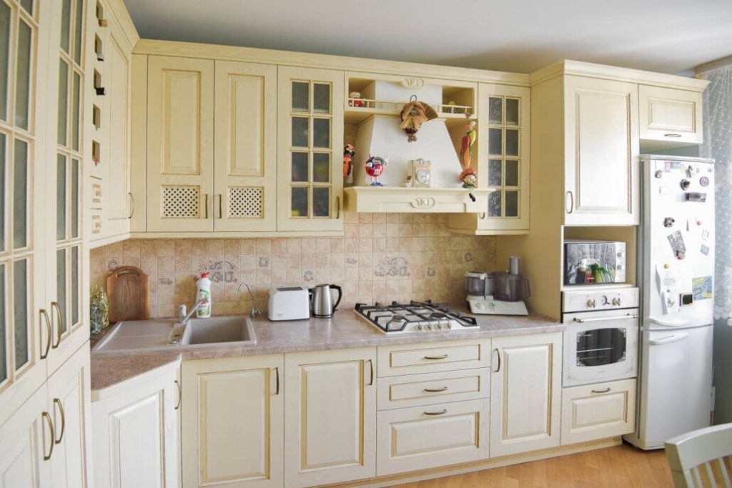 Самым оптимальным будет использование приглушенных и пастельных тонов, работающих на то, чтобы создать ощущение уюта, тепла и комфорта. Когда гарнитур белый, покрасить стены можно в нейтральный цвет. Или выбрать типичную для кантри палитру: