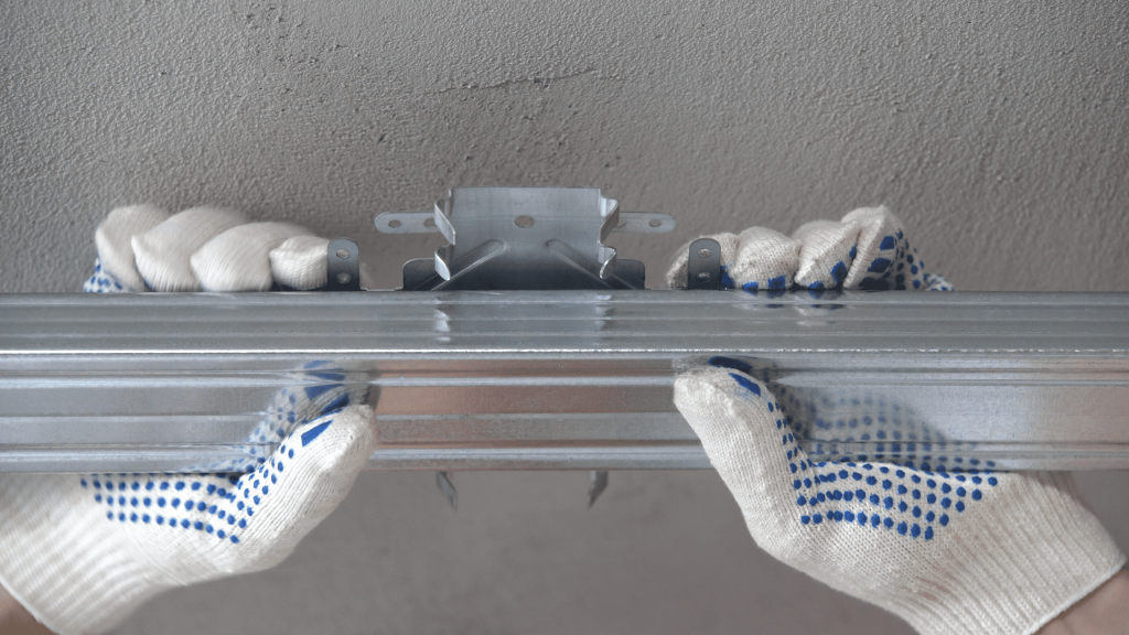 - Затем монтируют основной профиль. Для этого концы планок вставляют в направляющие и производят крепление планки к направляющим и подвесам с помощью саморезов, контролируя при этом вертикальность планок основного профиля уровнем.