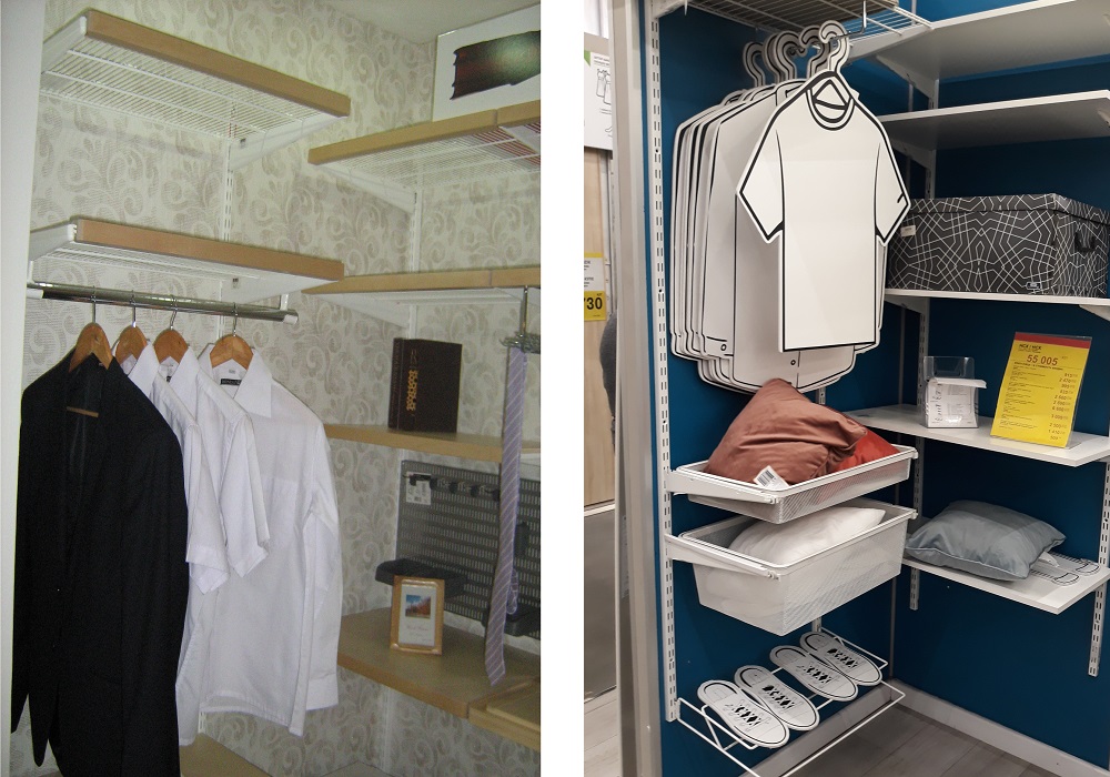 Обычно встраиваемые конструкции внутреннего наполнения шкафов-купе, гардеробных и кладовок крепятся непосредственно к стенам. А также лишены привычных для отдельностоящей мебели элементов – донышка с цоколем, крыши, задней стенки, примыкающих к стенам боковин