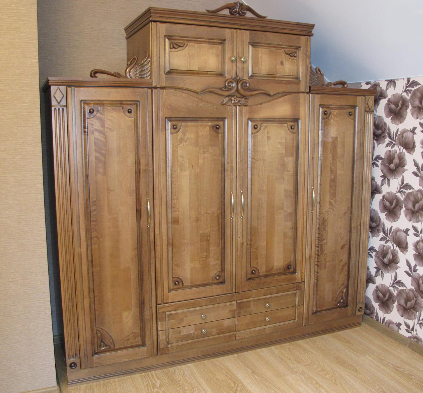 При изготовлении шкафов из дерева специалисты используют природную красоту древесины, ее натуральные цвета, неповторимую текстуру. Допускается различная колеровка с эффектами и без них. Особенно красиво выглядят в интерьере темные и золотистые оттенки материала.