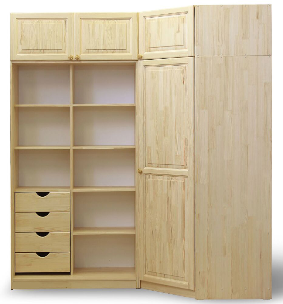 - Пятистенные – универсальные модели. Они легко впишутся в любое пространство. Деревянные шкафы такой формы обычно дополняются открытыми полками или аналогичными модулями.