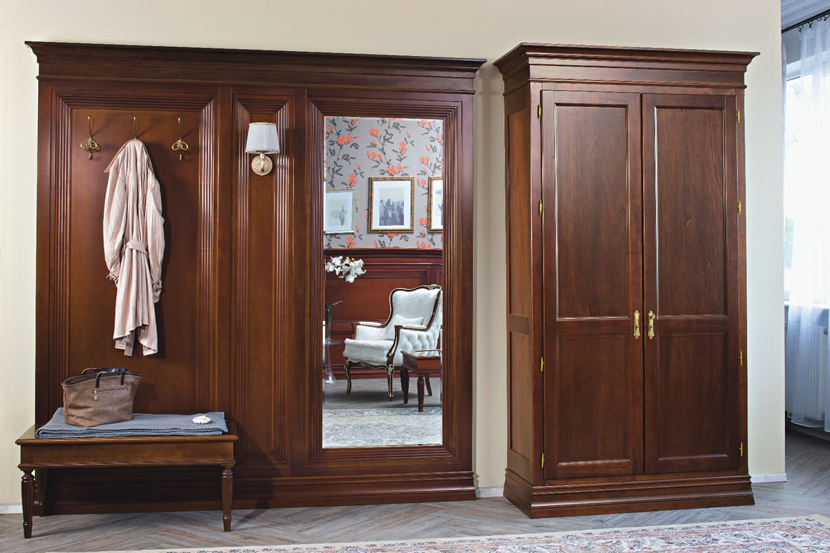Самые солидные, внушительные и стильные, но самые дорогие – это шкафы из массива дерева. Это хороший вариант для просторных прихожих и роскошных классических интерьеров. Чаще всего дерево берут для стенок и фасадов, а внутренние полки все равно делаются из более дешевых материалов.