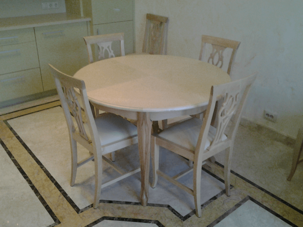 Не подходят для крошечных помещений, из-за того что требуют размещения в середине. Позволяют расположиться большему числу людей, чем за квадратным (до 8 персон). Но при этом тоже имеют ограничения в габаритах: если превысить диаметр 1,5 м, то появится тот же недостаток, что и у предыдущей разновидности.