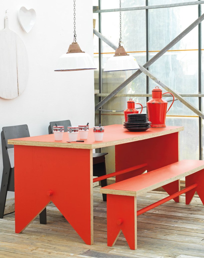 Красный стол — оригинальная модель, которая будет выделять кухню.