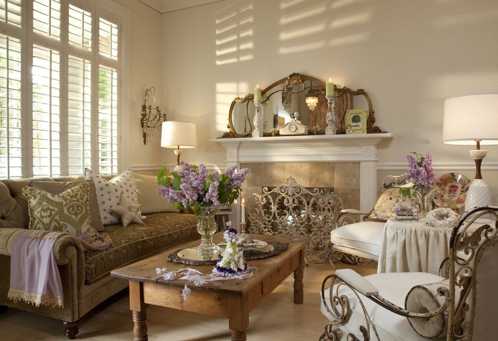 Самая наряженная комната в доме. Тут вы непременно увидите удачный мягенький диванчик, быстрее всего, в съемном чехле с воланами, на нем огромное количество декоративных подушек. Компанию ему составляет одно либо пара таковых же комфортных кресел. А завершает композицию низкий журнальный столик на фигурных ножках. Часто в гостиной устанавливают камин: традиционный, увенчанный стильной лепниной. Уместно будут смотреться тумбочки, маленькие комоды и серванты со обилием милых вещиц: рамками с фото либо вышивкой, статуэтками, вазочками, канделябрами, настольными светильниками, букетами.