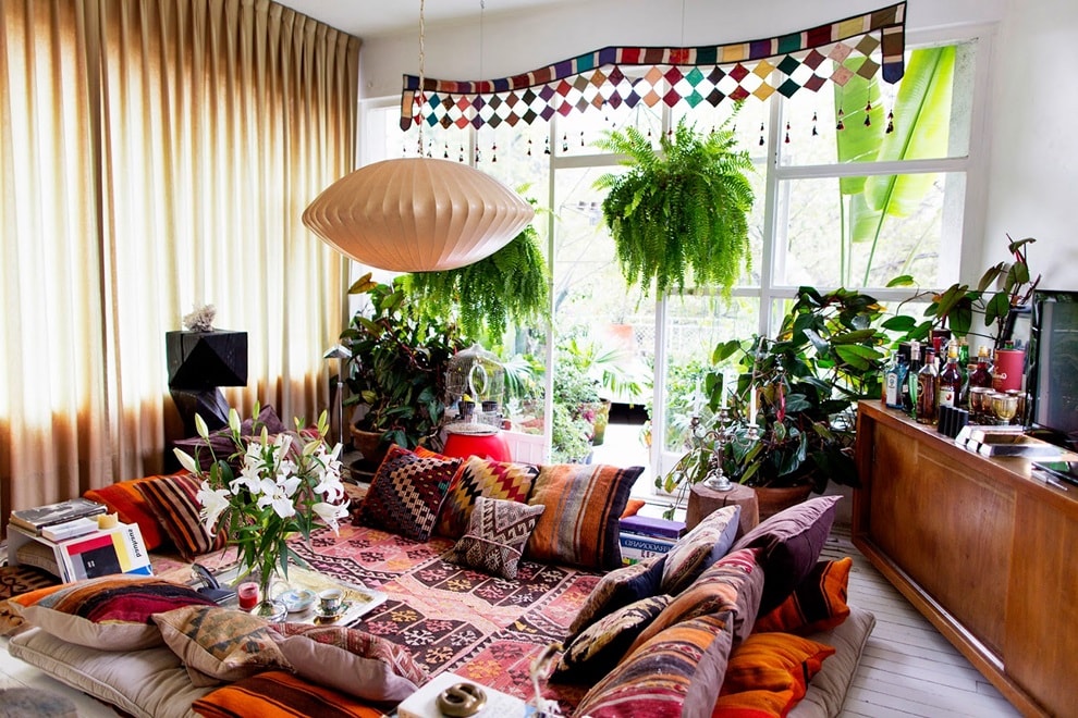 Благодаря хиппи стиль бохо приобрел новое дыхание, избавившись от налета декадентства и приобретя атмосферу расслабленности и радости жизни. В хиппи бохо интерьер переполнен этническим декором, макраме, ловцами снов, различными музыкальными инструментами и миллионом подушек, которые можно разложить на полу вокруг кальяна.