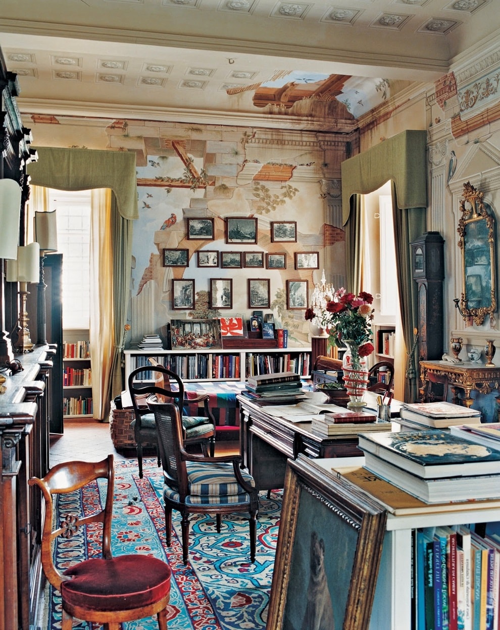 Сдержанное сочетание классической мебели и этнических мотивов. Строгая мебель теряется под бархатными покрывалами и атласными подушками, бежевые стены — под яркими гобеленами с контрастными узорами, а окна закрывают вычурные кружевные занавески. Это возможность оживить спокойный интерьер яркими деталями.
