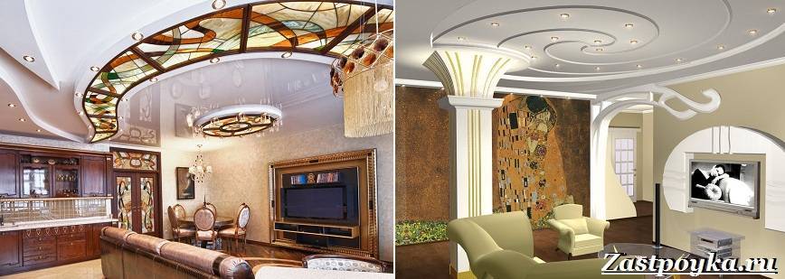 Для роскошной хрустальной люстры с подвесками или дизайнерского светильника необычной формы будет достаточно простого потолка, окрашенного в светлые тона. Если предполагается большое количество точечных светильников, следует заранее продумать подвесную конструкцию.