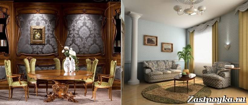 Особое внимание уделяется дереву — обычно используют ценную дорогостоящую дубовую или буковую мебель и декор.