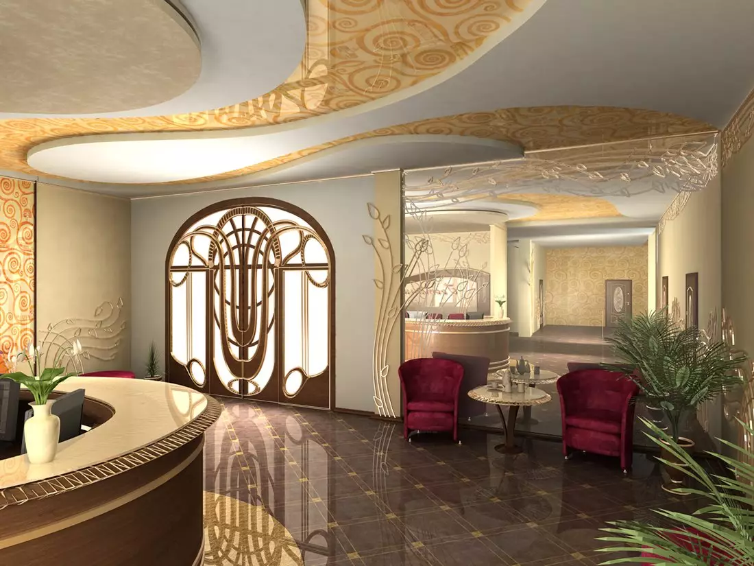 Важную роль в дизайне помещения в стиле Модерн играет декор. Раньше это характеризовалось лепниной на потолках, которая в настоящее время заменила себя конструкциями из гипсокартона, пластика и полимера.