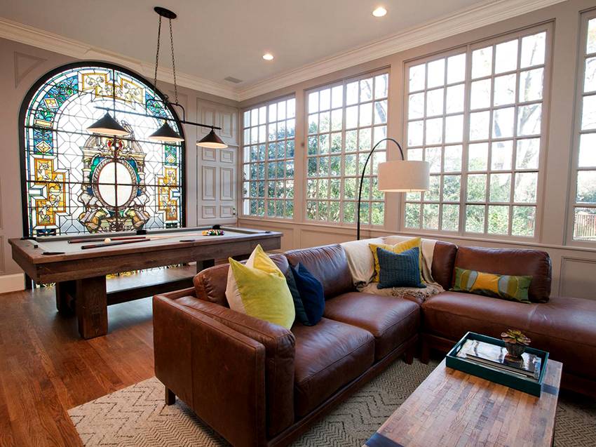 - витраж – это то, без чего трудно представить себе стиль модерн. Цветное стекло может украшать оконные и дверные проемы, светильники, быть элементом мебели или лестницы. Лучи, проходя через витраж, устраивают настоящую игру света и создают в комнате сказочную атмосферу;