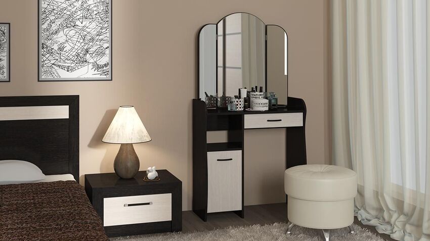 Классическая модель трюмо в современном исполнении. За счет использования ЛДСП толщиной 1.6 мм, широких пространств между опорными стойками и без рамного монтажа зеркала создает визуальное ощущение хрупкости и легкости. Модель производится из ЛДСП отечественного производителя, без использования химически вредных наполнителей, клеев и красок. В качестве защитного покрытия используется полимерная клейкая пленка с рифленой поверхностью. Поверхность устойчива к влаге, воздействию температур до + 45 градусов, бытовым чистящим средствам. Несмотря на темный цвет, структура расцветки устойчива к длительному воздействию прямых солнечных лучей. Главной особенностью модели является зеркало, состоящее из трех частей. Средняя часть с закругленной верхней кромкой монтируется на основание из ЛДСП толщиной 2 см, без выступов. К основанию средней части монтируются боковые подвижные створки чуть меньшего размера. Еще одной зоной столика является боковая часть тумбы. Она оснащена глубоким вместительным шкафчиком с одной полкой. между столешницей и шкафчиком есть свободная открытая ниша. Дополняет свободный объем для хранения выдвижной ящик, с доводчиком и возможностью открытия нажатием. Внутреннее пространство ящика имеет 2 отсека, для раздельного хранения вещей.