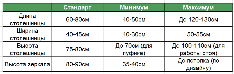 Нагляднее всего представить размеры туалетного столика в табличной форме, ниже рассмотрим пояснения к минимальным и максимальным размерам.