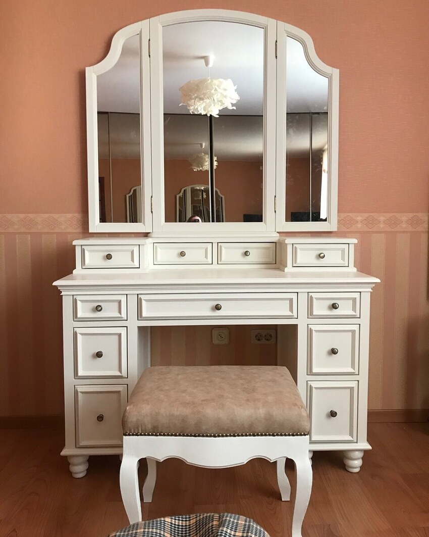 - Трюмо. Классика жанра – туалетный столик «трюмо» с большим зеркалом. Откидная конструкция позволяет убирать зеркало, когда оно не используется, сохраняя его чистоту и освобождая место.