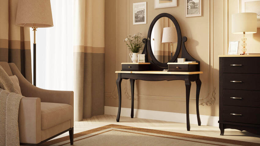 Классический туалетный столик – представляет собой обычный стол с четырьмя ножками, приставленный к стене, на которой располагается зеркало. Может иметь выдвижной ящик.