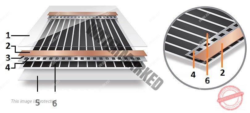 На схеме показан инфракрасный пленочный пол с карбоновыми полосами, медной и серебряной подложкой. также существуют варианты с: