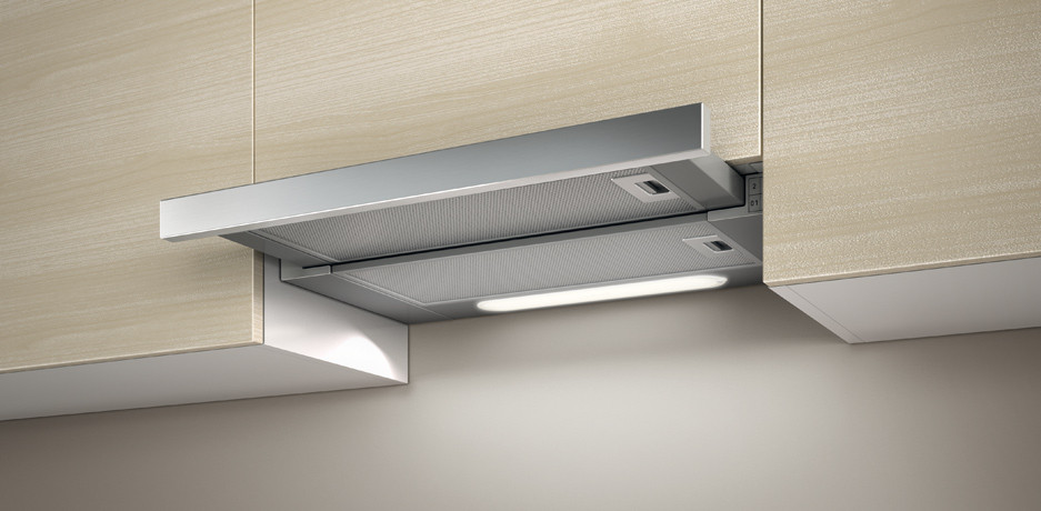 Это более функциональный вариант, который не бросается в глаза и никаким образом не способен испортить интерьер. Монтируют такую вытяжку над плитой в навесной шкафчик. Многие модели оснащены выдвижной панелью, с помощью которой можно увеличивать поверхность вытяжки и, соответственно, увеличивать ее производительность. В плане цены такие вытяжки не намного дороже традиционных, поэтому лучше отдать предпочтение такому варианту, особенно если вы покупаете устройство вместе с кухонной мебелью.