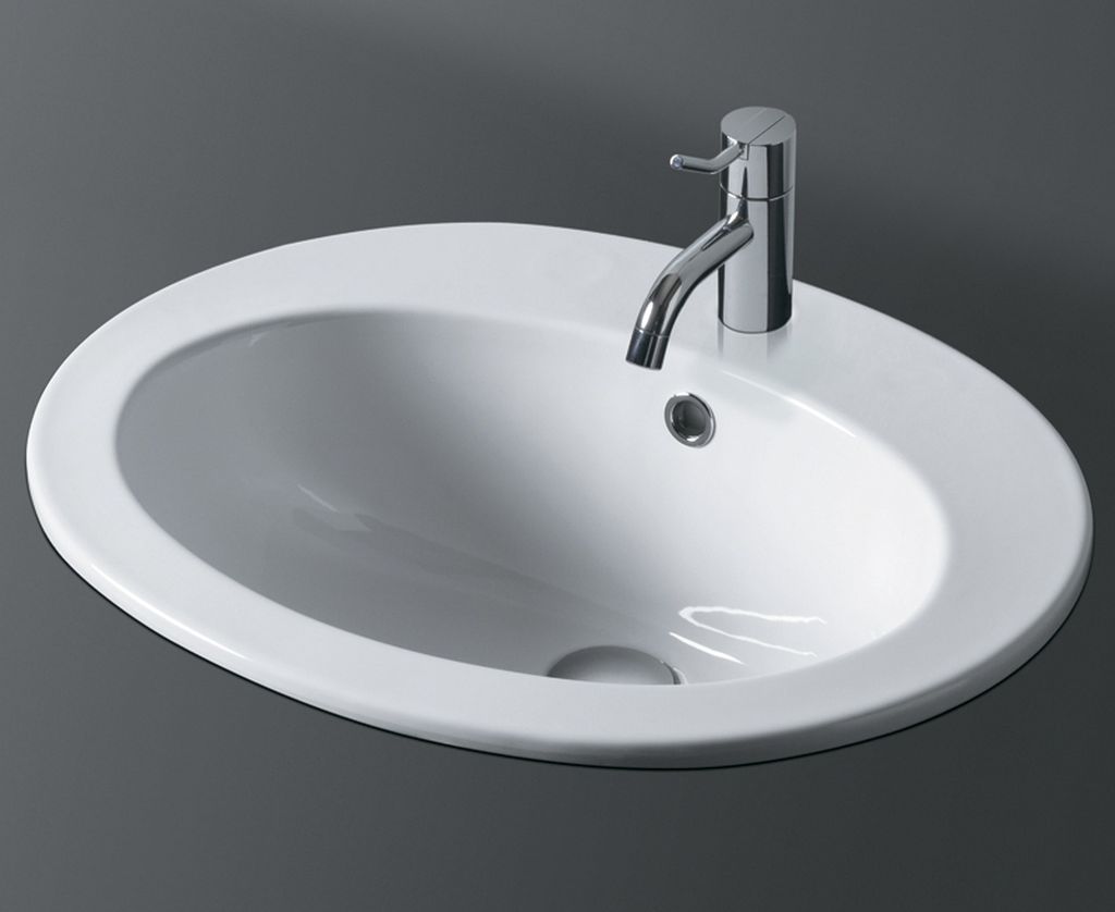 Накладной вариант – современная инновационная модель. Главное отличие от других разновидностей – способ установки. Раковина выставляется на поверхность (столешницу, стиральную машину). При этом отсутствуют стыки, в отличие от встроенного вида, накладная ставится наверх поверхности, а не в вырезанное отверстие.