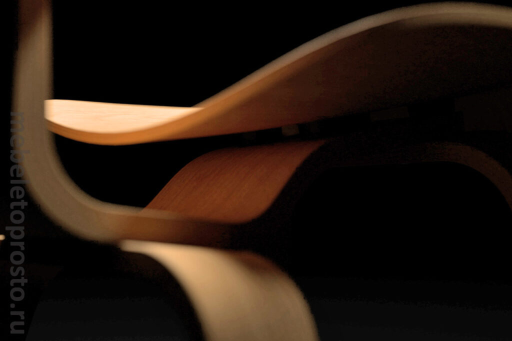Для спинки и сиденья используется пятислойная фанера, для основания и соединительных элементов – восьмислойная. Именно эта комбинация обеспечивает стулу то самое необыкновенное сочетание прочности и упругости