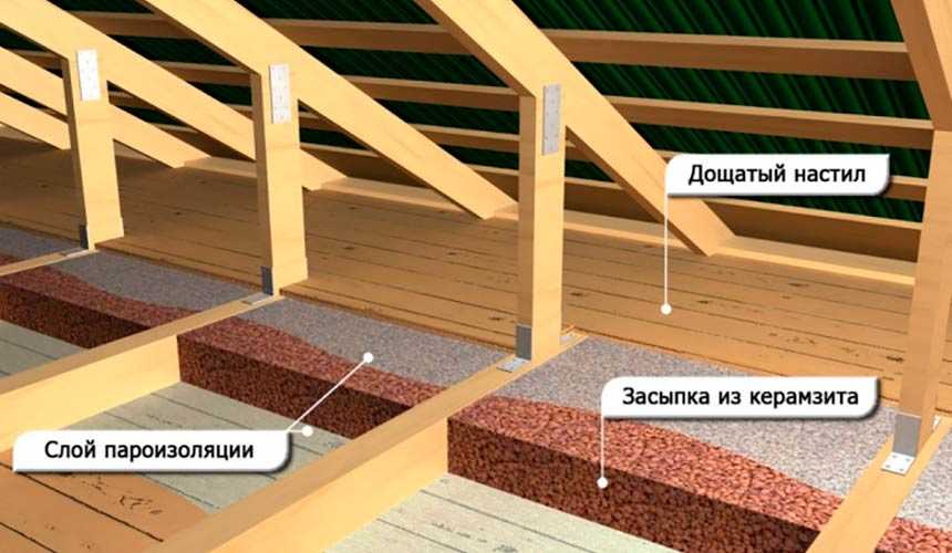 В качестве утеплителя используют керамзит с размером фракции 5–10 мм, перлит, шлак, сухой песок, пенопласт или минвату. Сыпучие материалы более доступны, но утяжеляют конструкцию. Наиболее приемлемый вариант для частного дома – минеральная вата обладает низкой теплопроводностью, отталкивает влагу и, в отличие от пенопласта, пропускает воздух.