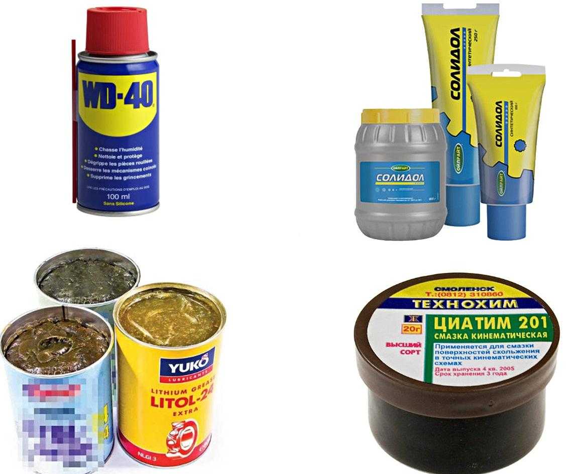 средства, применяемые для смазки машинных агрегатов. Например, солидол (может работать в диапазоне температур от -30ºС до 65ºС) или литол, работающий в температурном режиме -40ºС – +120ºС.