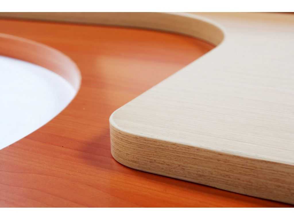 Заводская продукция отличается плавностью линий, нетравмоопасна, надежна, долговечна и безопасна для здоровья окружающих. Края всегда обрабатываются либо кромочными лентами, либо дополнительным слоем ламинирующей пленки.