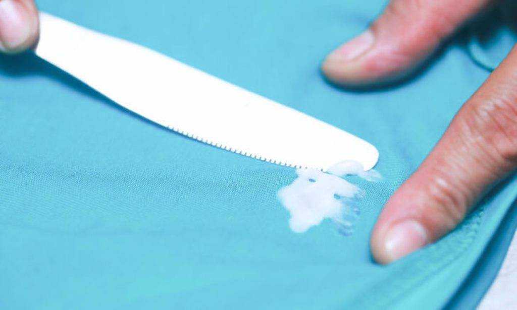 Учитывая, что после полимеризации средство прочно держится на основании, проще всего срезать или отскоблить его. Это возможно только для шершавых, не боящихся абразивов поверхностей. Глянцевые и гладкие покрытия таким способом лучше не очищать, потому что можно испортить. Для механической очистки можно использовать любой острый и тонкий инструмент: