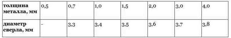 Таблица соответствия диаметра сверл для острых саморезов и толщины металла