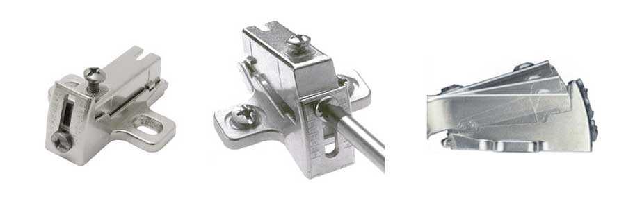 - Устанавливаемые без использования сверла. Такие петли пригодятся, если толщина дверки недостаточная для установки чашечных петель. Отрицательной стороной в установке этой фурнитуры является то, что регулирование положения дверок возможно только в одной плоскости (вверх-вниз или дальше-ближе).