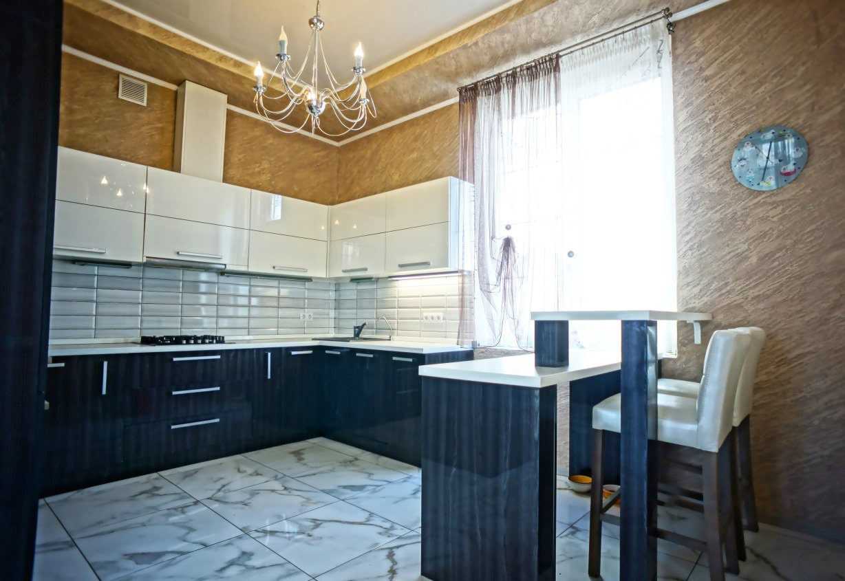 В этом случае ваша кухня будет выглядеть величественно и идеально подойдет для приема гостей за неимением гостиной комнаты. Если же ваша кухня – уютный уголок, где вы планируете устраивать семейные ужины, а также пить чай и глинтвейн в домашней обстановке, остановите свой выбор на имитации шелка. А вот для молодой и современной пары можно предложить отделку с имитацией апельсиновой корки.