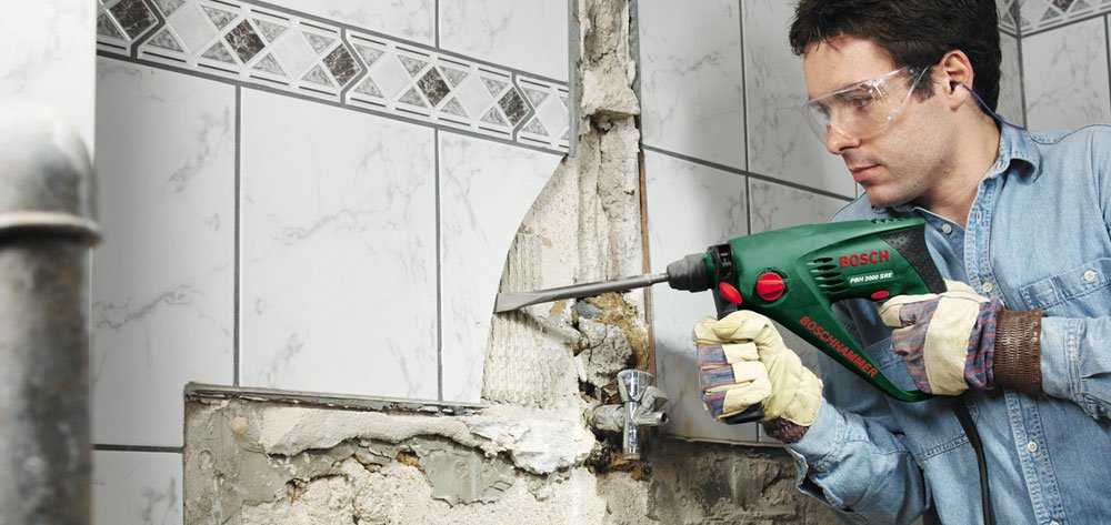 Кафель необходимо удалять вместе с плиточным клеем. Очищение стен от керамической облицовки производится с помощью перфоратора, оснащенного насадкой в виде зубила. Сначала сбивается плитка, затем снимается фиксирующий материал. Если в открывшемся слое штукатурки есть дефекты, нужно счистить его до бетонного основания. От прочного покрытия отказываться не стоит.
