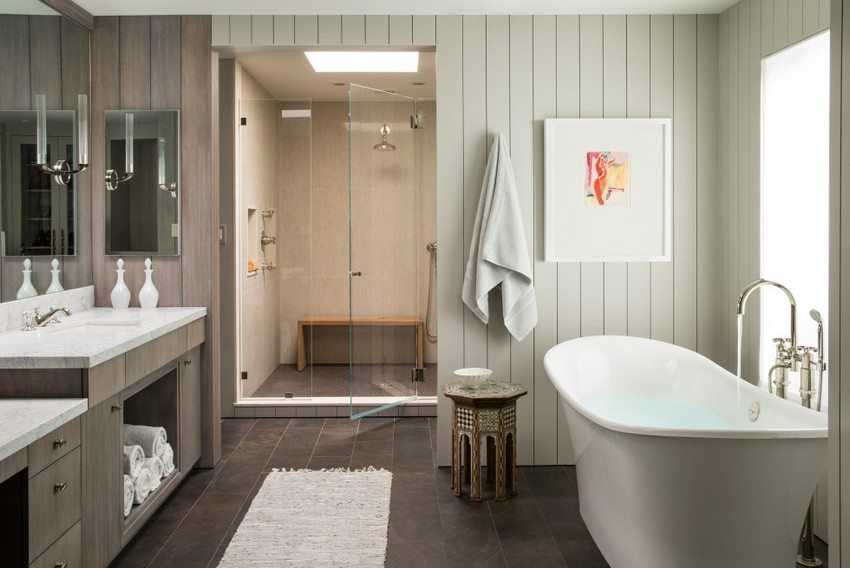 В ванной, санузле и душевой иногда требуется двойная обшивка. Поэтому там особенно важен каркас, способный выдерживать частые механические нагрузки. С этой целью снижают шаг установки профилей и подвесов, выполняют установку поперечин на стеновые конструкции. Рекомендуемый шаг для установки элементов каркаса в ванной – 40 см и меньше в вертикальном и горизонтальном направлении. Особенно это касается мест расположения ниш, коробов и т. п. из гипса, если они тоже сооружены под плитку. Все элементы крепежа в ванной должны быть оцинкованы.