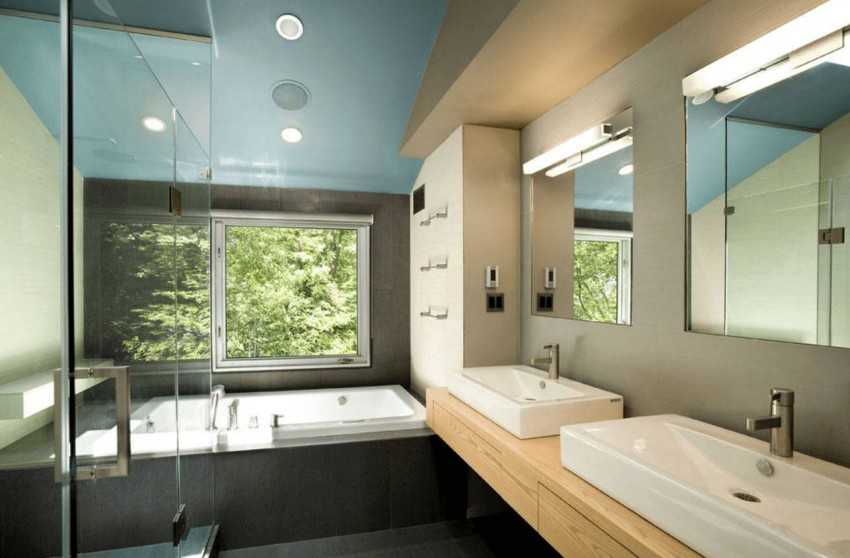 Эстетичный вид потолка. Немаловажный фактор при выборе отделки. Цветовое решение, текстура и поверхность потолка должны подходить под общий интерьер ванной комнаты. В случае гармоничного сочетания цветов облицовочного материала стен и потолка, в комнате будет достигаться эффект спокойствия и расслабления, что так необходимо после тяжелого рабочего дня;