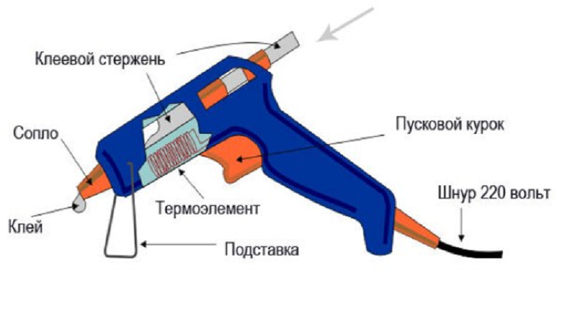 Внутреннее содержимое клеевого прибора приведено на фото. В конструкцию пистолета для склейки входят: