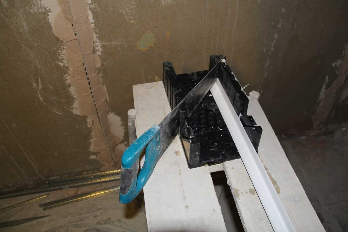 С этой целью рейка или кабель-канал закрепляется в корпусе стусла с упором в торцовую стенку и ножовкой по дереву или металлу (в зависимости от материала рейки) точно выполняется нужный распил.