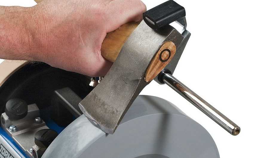 Чтобы наточить топор, в качестве приспособления для заточки используется электроточило. В состав оборудования входит абразивный круг, которым снимается нужный слой металла за счет его большой скорости вращения.