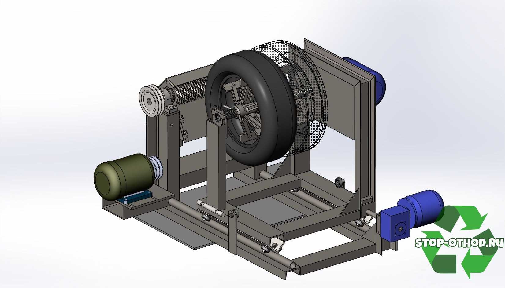 Для разрезания шин и удаления металлического корда используется конструкция из стойки и несущей рамы. В корпусе расположена система зажима шины, которая во время резки вращается совместно с шиной. Стойка конструкции оснащена клиновидным ножом, настраиваемым на конкретный размер покрышки. Данная технология монтажа конструкции экономит время на подготовку расходного материала к дальнейшему измельчению в шредере.
