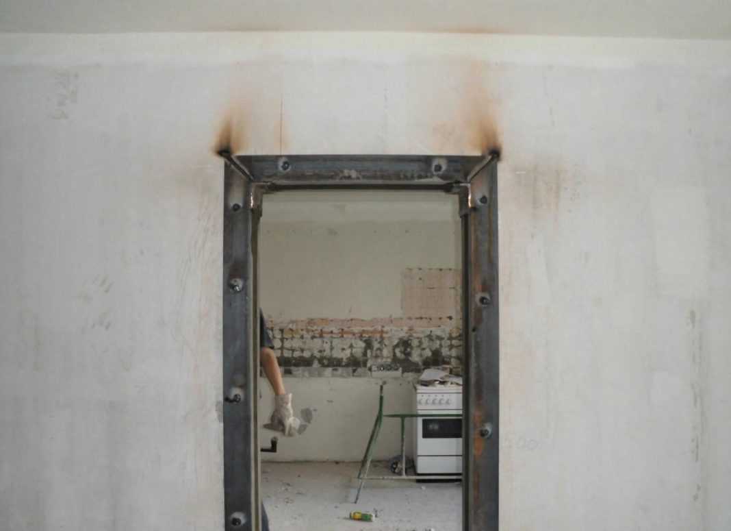 При этом не забывайте, что цена халатности или пренебрежению правилами техники безопасности в данном случае – человеческое здоровье или даже жизнь – не поддерживаемое перекрытие может упасть. - Демонтируется кирпичная кладка дверного проема с двух сторон стены, чтобы опоры оказались по обе стороны и конструкция не ослабла. После того, как проём будет готов, металлические подпоры соединяются между собой металлическими полосами для жёсткости.