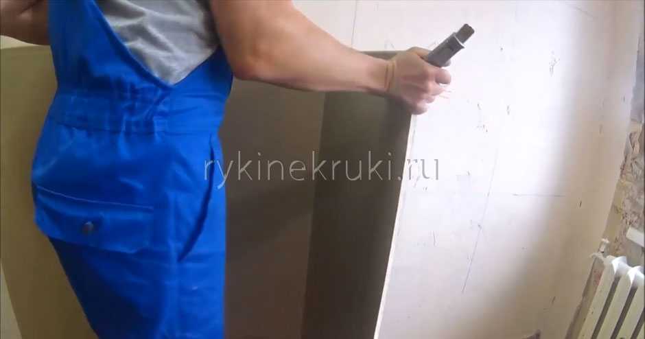 Итак, кладем лист гипсокартона внутренней (тыльной) стороной на пол (стол) или ставим стоймя, облокотив на стену, внутренней (тыльной) стороной к стене, внешней (лицевой) к себе. При помощи рулетки и карандаша на внешней (лицевой) стороне гипрока отмечаем расстояние, которое нужно отрезать. Делаем сверху и снизу листа карандашом две метки: