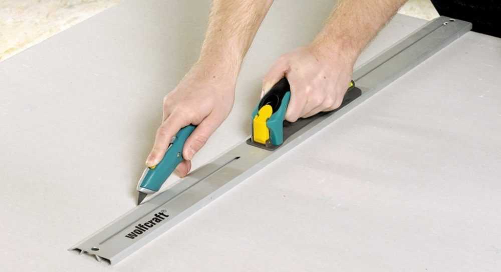 Монтажный нож подходит, чтобы разрезать гипсокартон на большие продольные части. Сначала сделайте необходимые замеры с помощью рулетки и карандаша, приложите к начертанной линии металлическую линейку и начните резать материал острием по краю этой самой линейки.