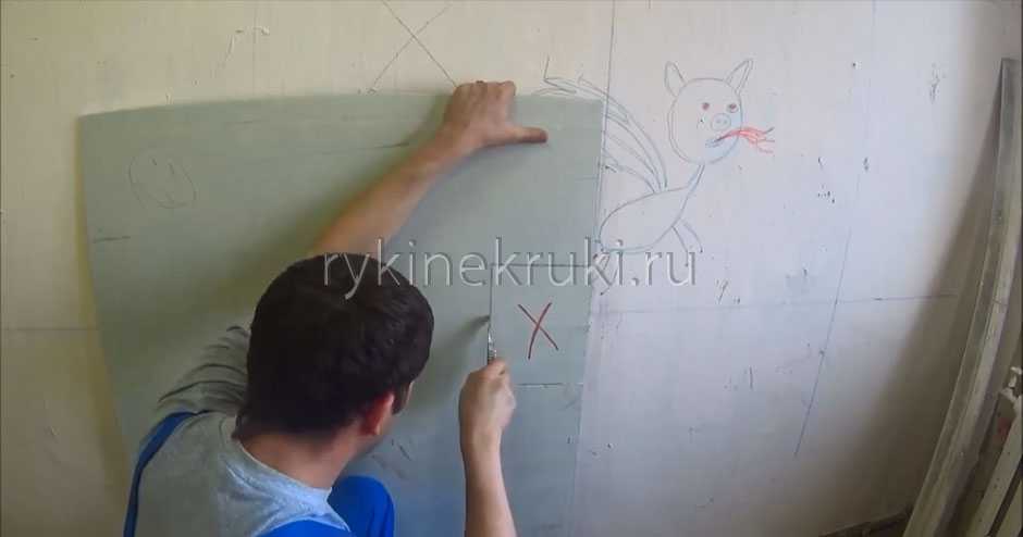 - Отмечаете на стене место будущего отверстия и аккуратно подрезаете его ножом для образования небольшой выемки. Она понадобится, чтобы острая ножовка не соскочила в сторону во время обработки;