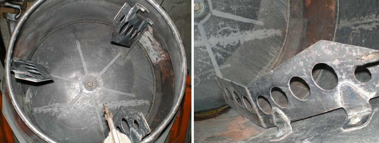 Это направляющие и рассекающие лопасти, приваренные к внутренним стенкам емкости. Они направляют падение переворачиваемых пластов, рассекая их при этом на отдельные части.