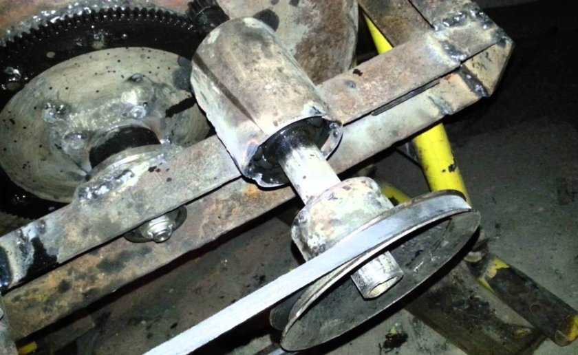 Работа по сборке бетономешалки начинается с того, что устанавливается вал, к которому крепятся металлические лопасти. Для этого используется старое место крепления двигателя. А сам вал может быть изготовлен из металлического шкива, к которому привариваются детали из металла.