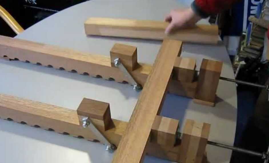 Есть как переносной, так и стационарный вариант такой конструкции, где нарезаются пазы для перемещения с креплением неподвижных упоров. Зажимом выступают мебельная гайка, шпилька и вороток. За счет этого можно работать с заготовками любых габаритов.