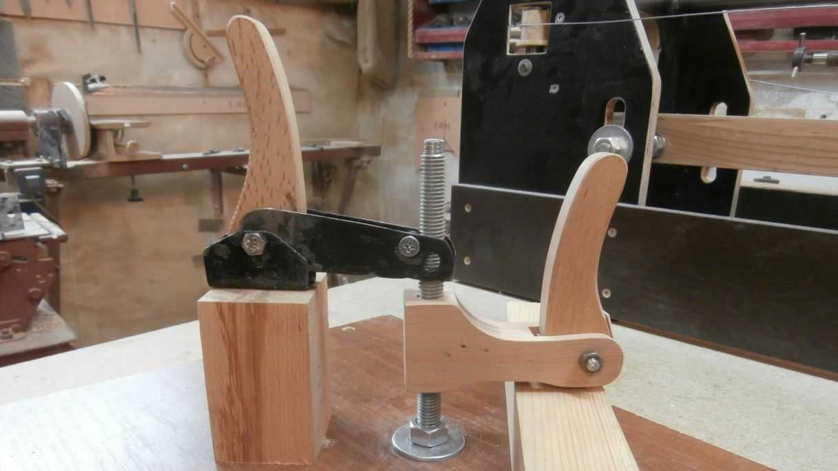 Из брусков выпиливаются рабочие клещи. В них строго параллельно сверлятся отверстия под шпильки, с небольшим люфтом.