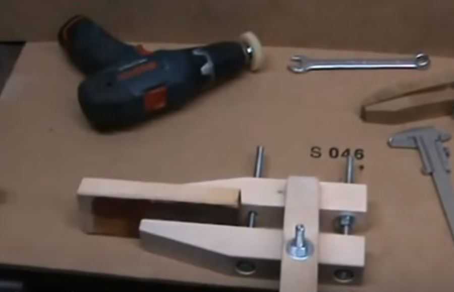 - Два деревянных бруска и нетвердого, но прочного материала. Подойдет сосна. Слишком твердая древесина будет оставлять следы на заготовке при сильной фиксации;